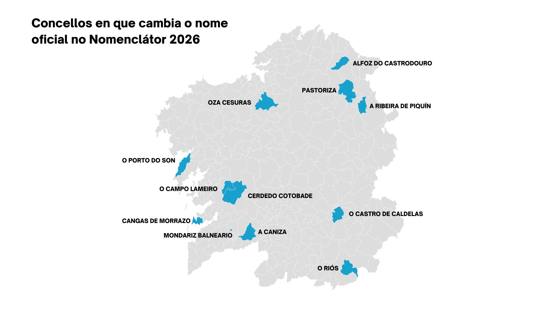 Los cambios más destacables de este nuevo Nomenclátor tienen que ver con la denominación de 12 ayuntamientos del país: así, el municipio ourensano registrado como Riós pasa a denominarse O Riós, en consonancia con sus atestaciones históricas y con el uso que la población hace del artículo; el municipio coruñés Porto do Son incorpora el artículo y se reconoce como O Porto do Son, algo que también sucede co Campo Lameiro, A Ribeira de Piquín y O Castro de Caldelas; en el lado opuesto, Pastoriza deja atrás el artículo; Cangas añade el apelativo Cangas de Morrazo; A Cañiza restituye la forma tradicional documentada desde antiguo, A Caniza; y Alfoz recupera su nombre histórico, Alfoz do Castrodouro. Por último, pierden el guion Oza Cesuras, Cerdedo Cotobade y Mondariz Balneario para adaptar sus denominaciones a las Normas ortográficas e morfolóxicas do idioma galego.