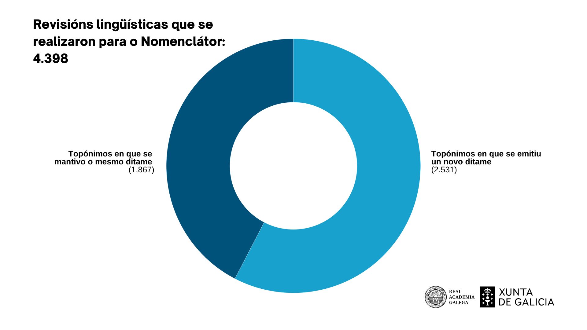 Dentro del primer gran grupo de revisiones, se estudiaron 4.398 topónimos que presentaban algún problema de tipo lingüístico. De estos 4.398, 2.531 fueron objeto de un nuevo dictamen, casi 6 de cada 10 de los topónimos sobre los que hubo reclamaciones.