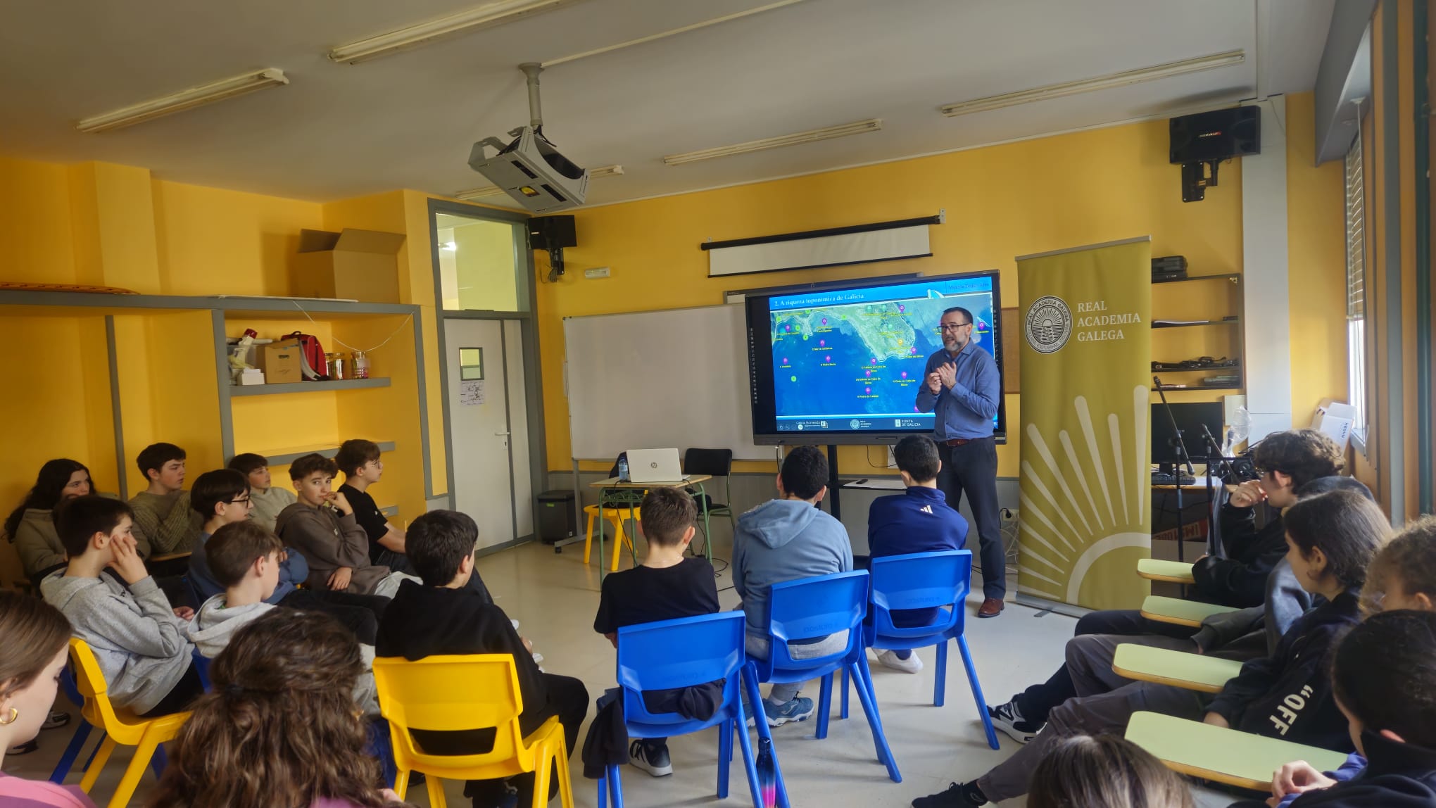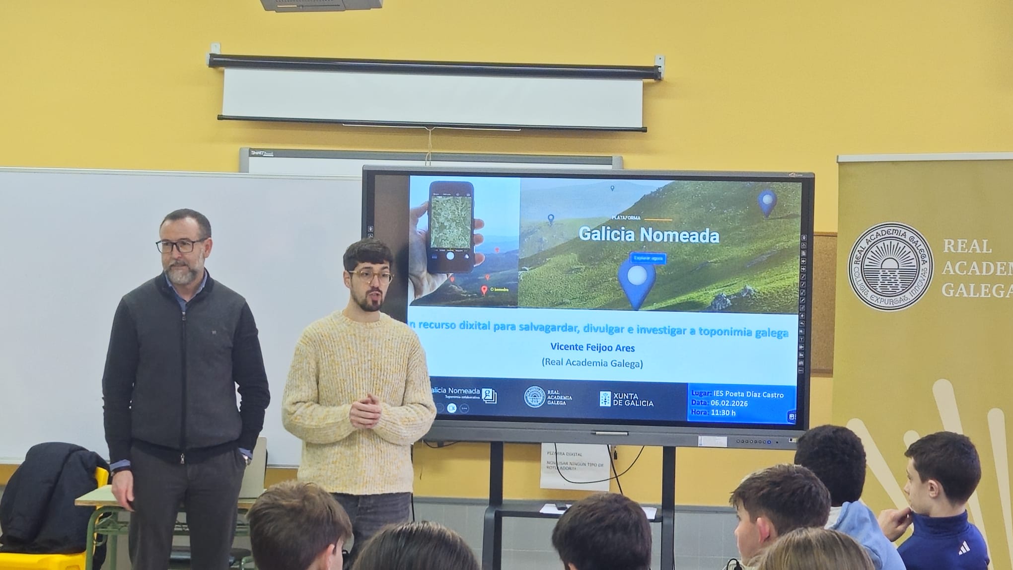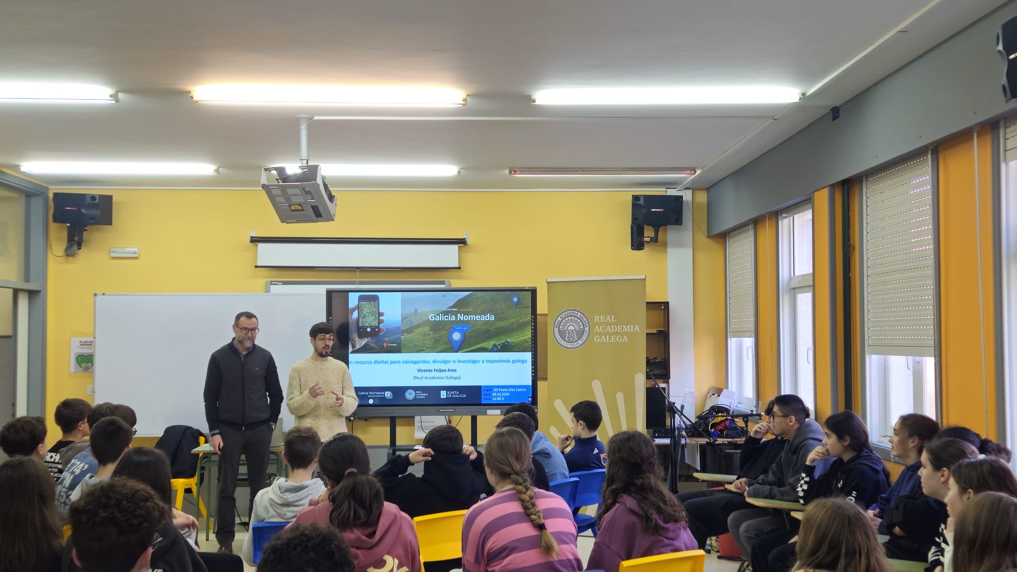 Galicia Nomeada vuelve a entrar en las aulas del IES Poeta Díaz Castro. Vicente Feijoo, coordinador técnico del proyecto, visitó este viernes 6 de febrero este centro guitiricense con el fin de implicar a su comunidad educativa en esta gran tarea colectiva que suma miles de personas implicadas por toda Galicia y decenas de centros de enseñanza del país.