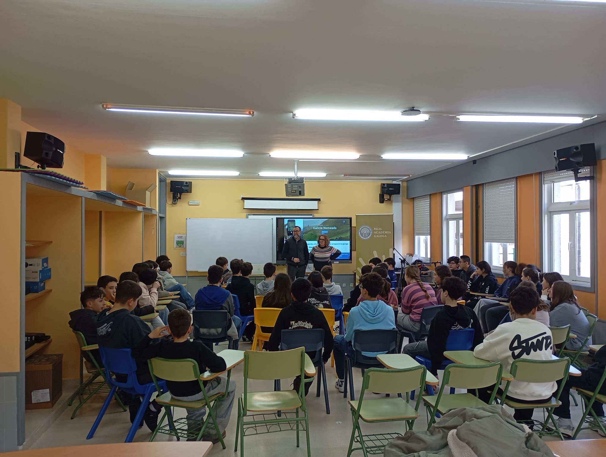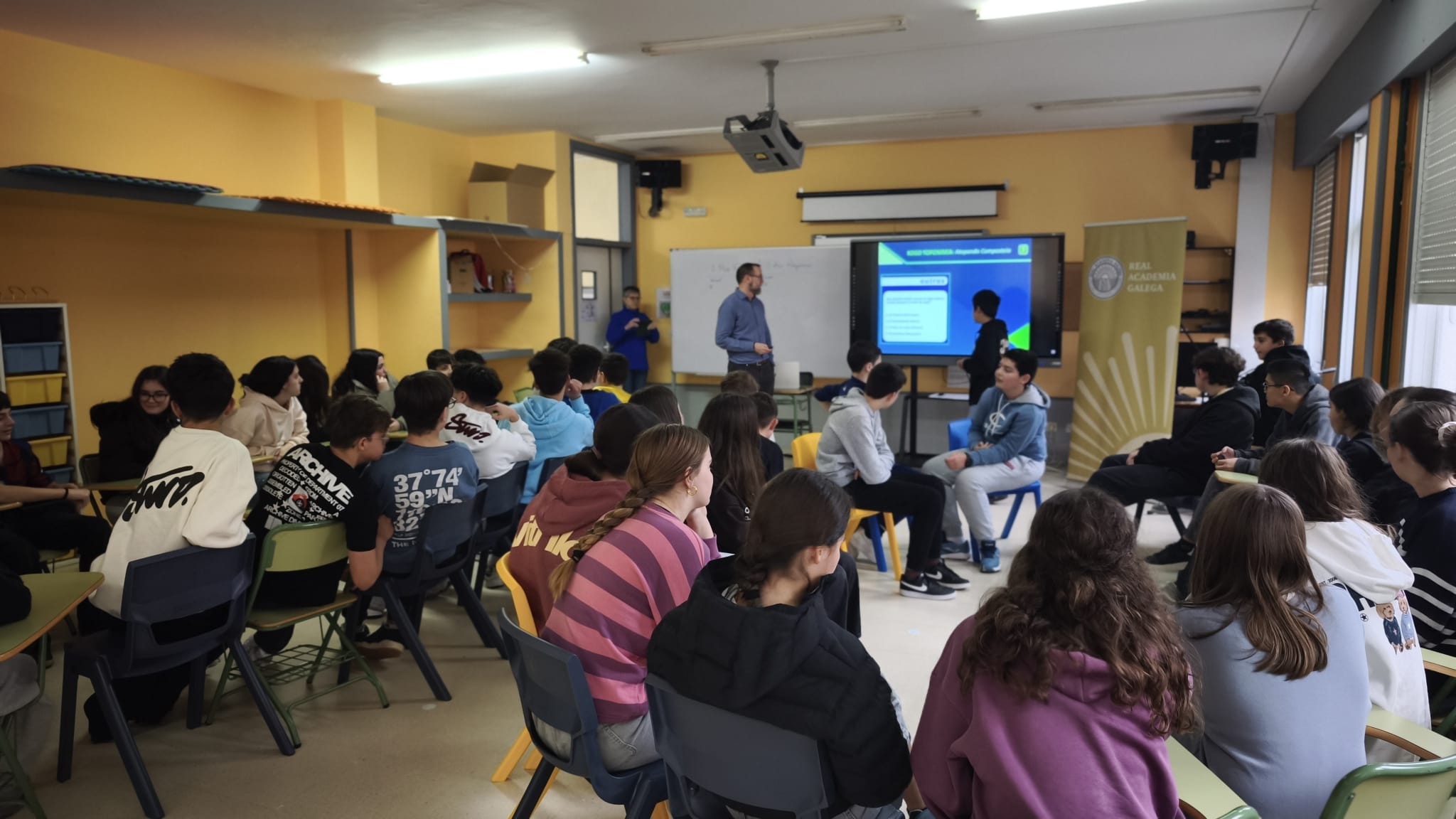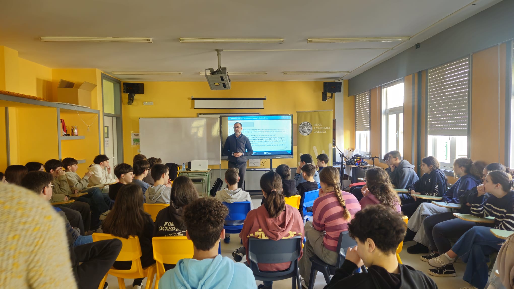 Galicia Nomeada vuelve a entrar en las aulas del IES Poeta Díaz Castro. Vicente Feijoo, coordinador técnico del proyecto, visitó este viernes 6 de febrero este centro guitiricense con el fin de implicar a su comunidad educativa en esta gran tarea colectiva que suma miles de personas implicadas por toda Galicia y decenas de centros de enseñanza del país.