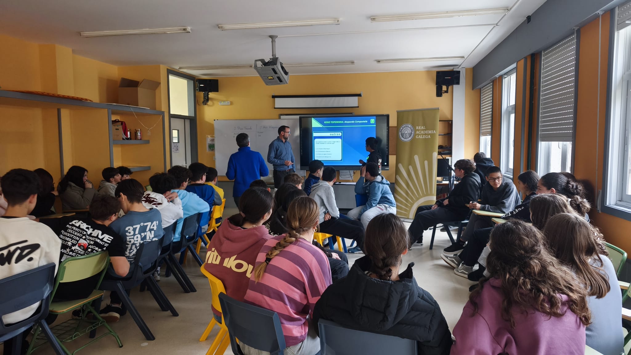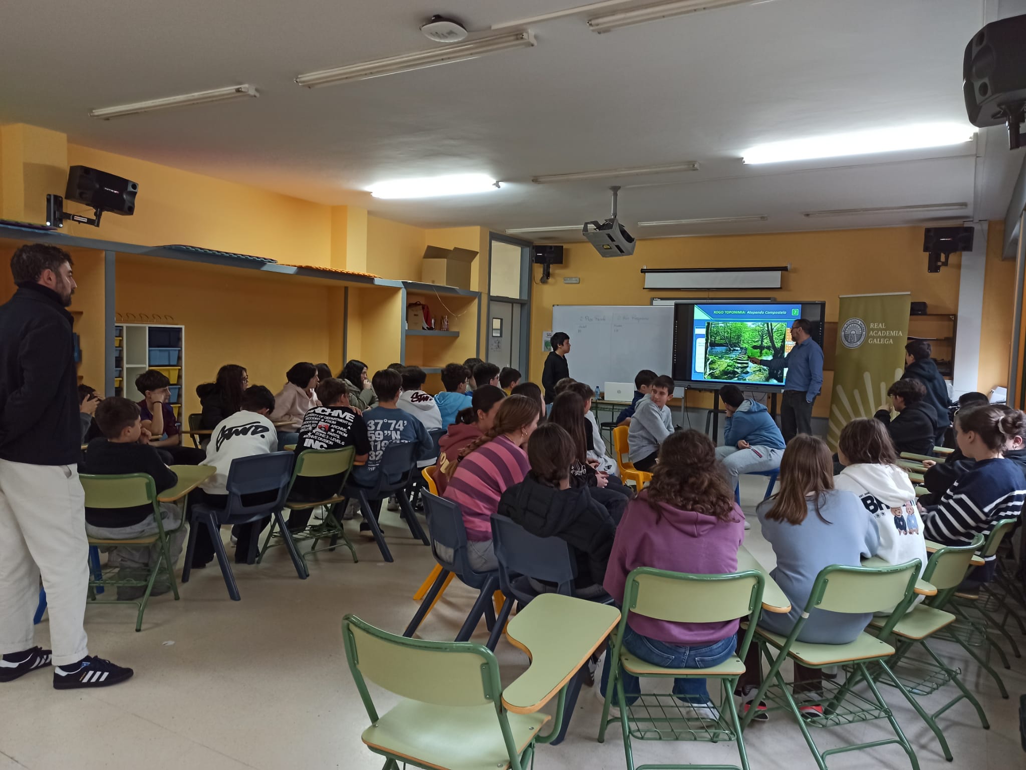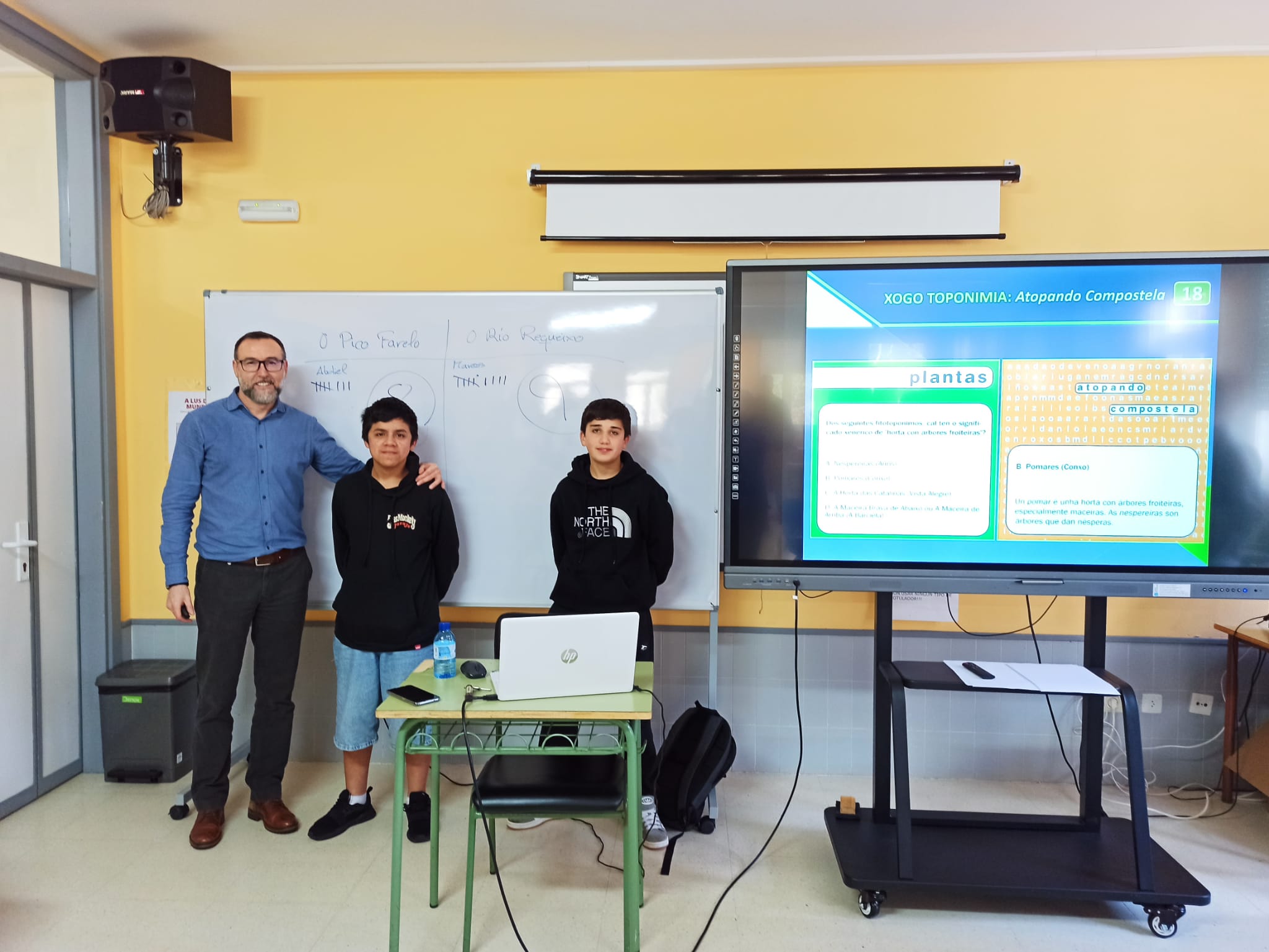 Como colofón de esta charla, y dada la buena disposición del alumnado, Vicente Feijoo dedicó la última hora de la jornada a que los chicos y chicas demostrasen sus conocimientos de léxico y toponimia gallega: a través de un juego basado en el recurso Atopando Compostela, los niños y niñas sacaron su instinto competitivo para ir respondiendo por grupos a diferentes cuestiones sobre topónimos comunes a todo el territorio gallego. Esta última actividad didáctica sirvió para que el alumnado ampliase sus conocimientos sobre el vocabulario de nuestra lengua y sobre cuestiones históricas y culturales a través de los nombres de lugar.