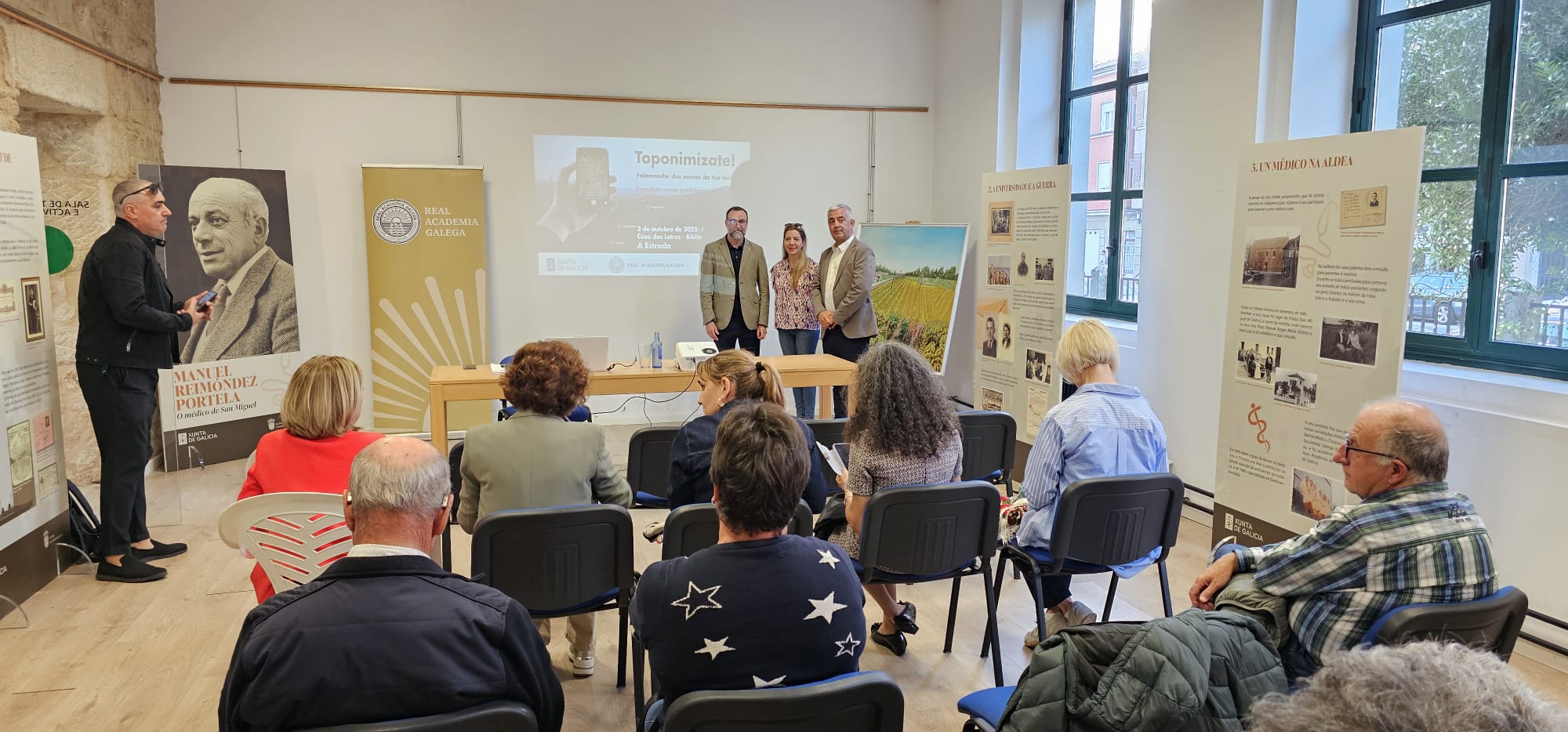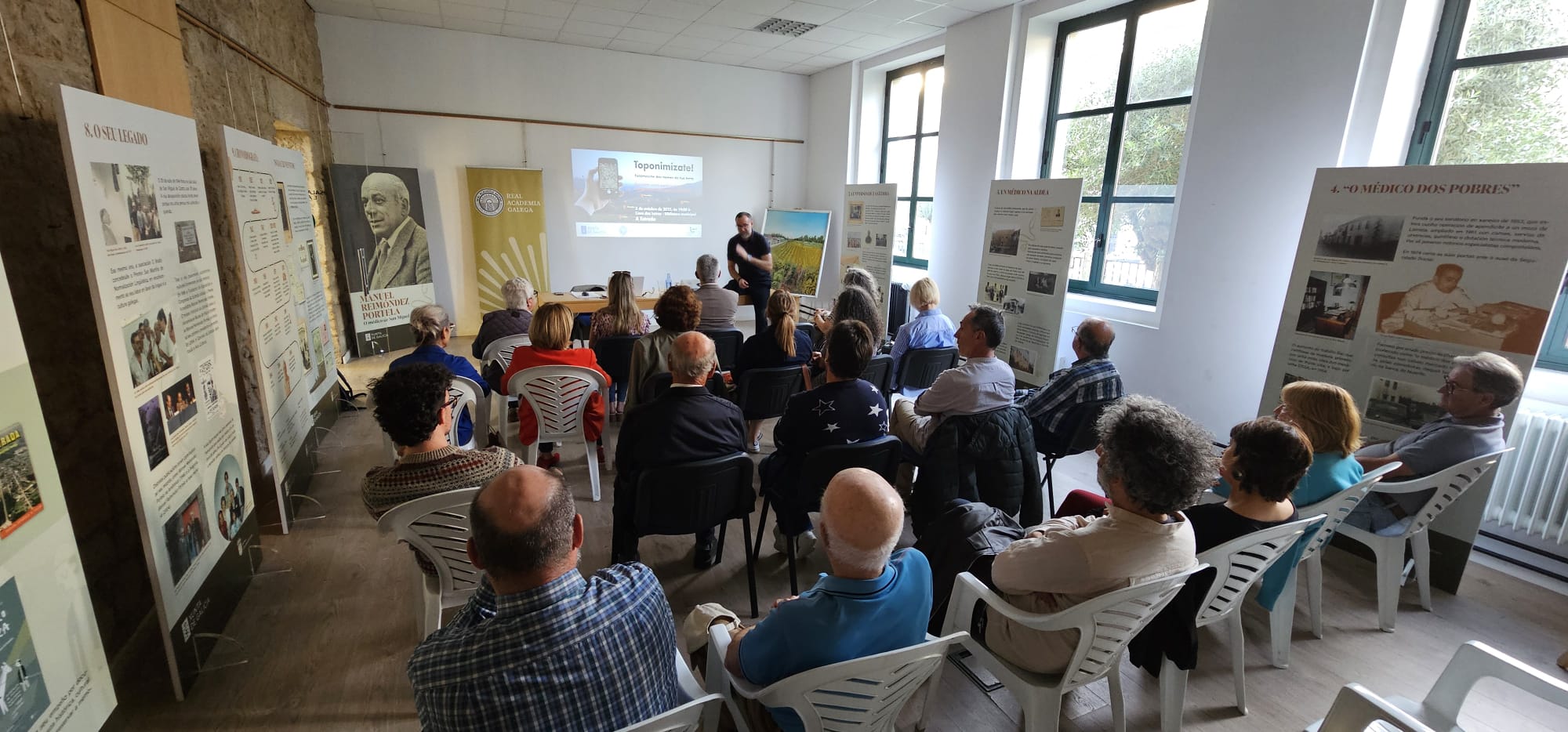 El lugar elegido para la charla no pudo ser mejor: una de las salas de la Casa das Letras de A Estrada que desde el pasado 24 de septiembre también acoge la exposición, Manuel Reimóndez Portela. O médico de San Miguel, un sentido y más que merecido homenaje de su ayuntamiento a quien fue conocido como “o médico dos pobres”. Este médico rural, además de su bondad en el ejercicio de la profesión durante décadas en su municipio natal, destacó por su compromiso con la cultura de A Estrada y gallega, recogiendo y divulgando la memoria colectiva de la comarca y también su microtoponimia: en la obra A Estrada rural, Raimóndez Portela realizó una recogida exhaustiva de sus "chamadeiros" “un a un ata formar un conxunto de miles de nomes (...) despois de ter ido por cada unha das parroquias e incluso da maioría dos lugares”, tal y como destaca el propio autor en las páginas del libro.