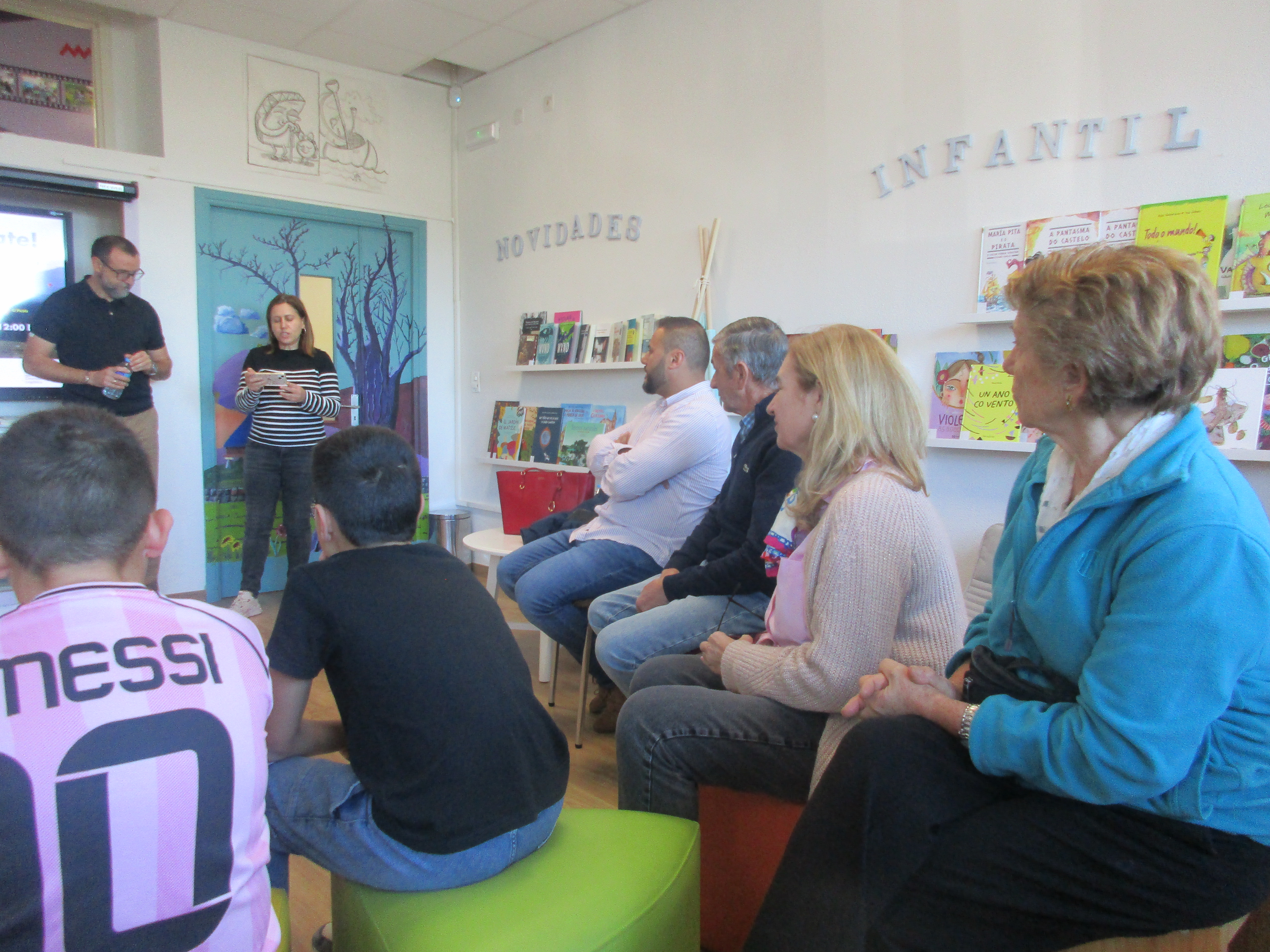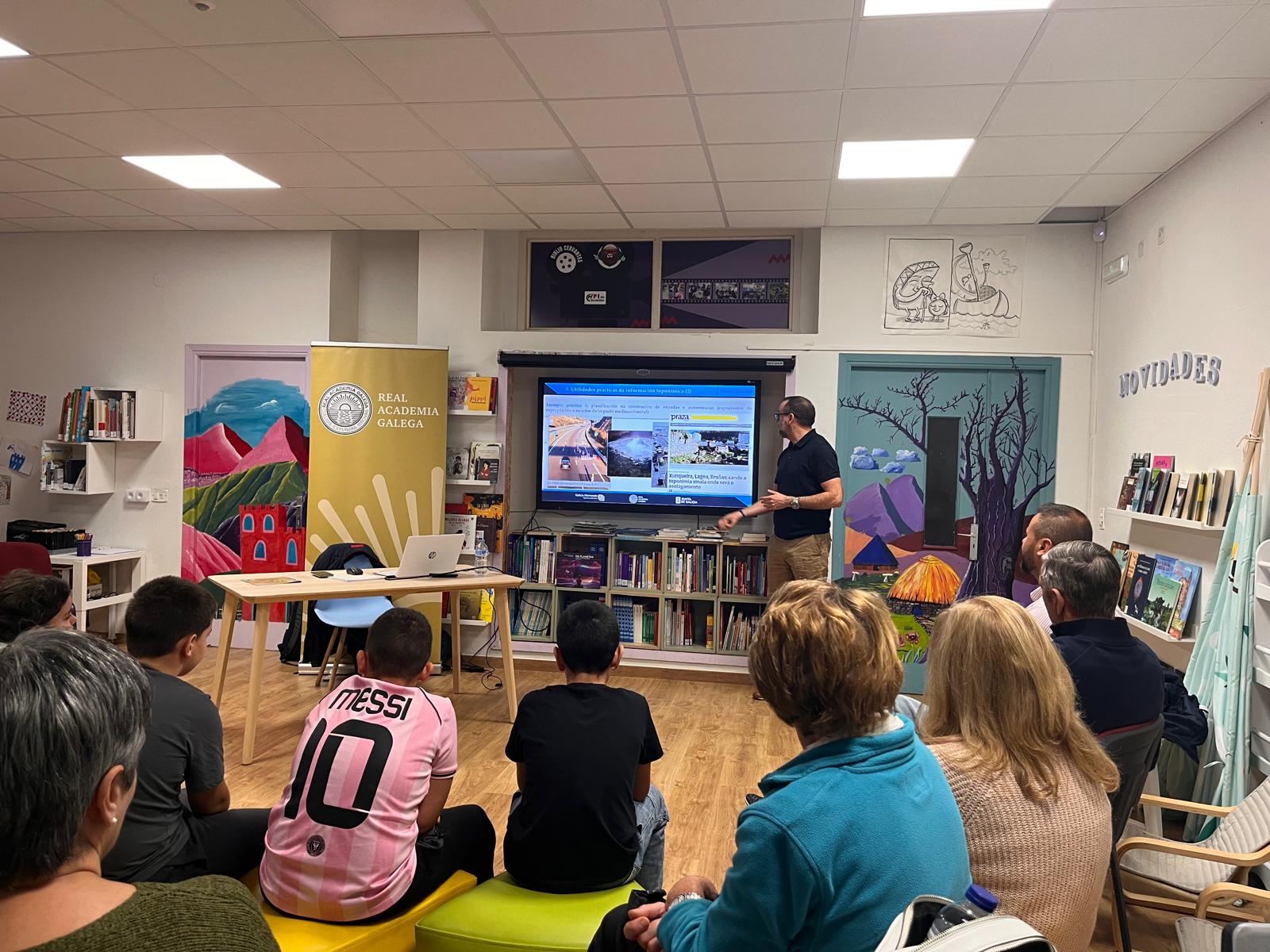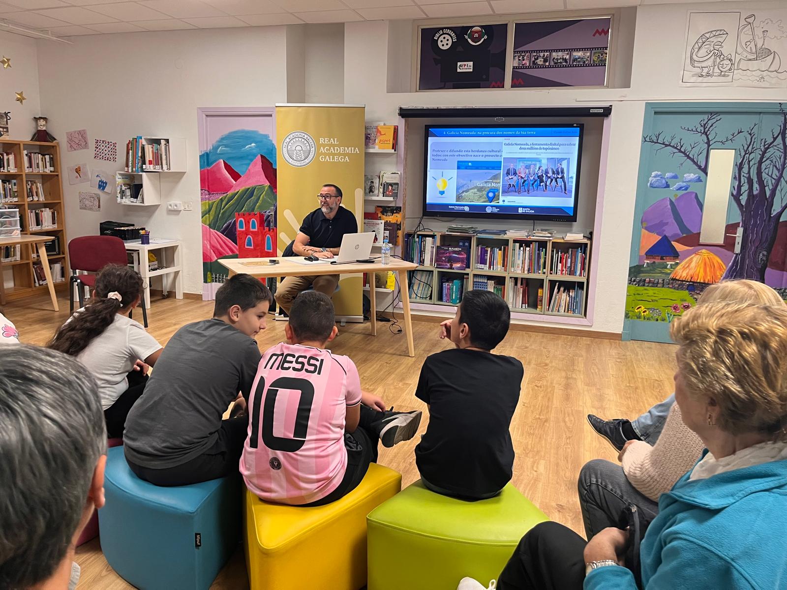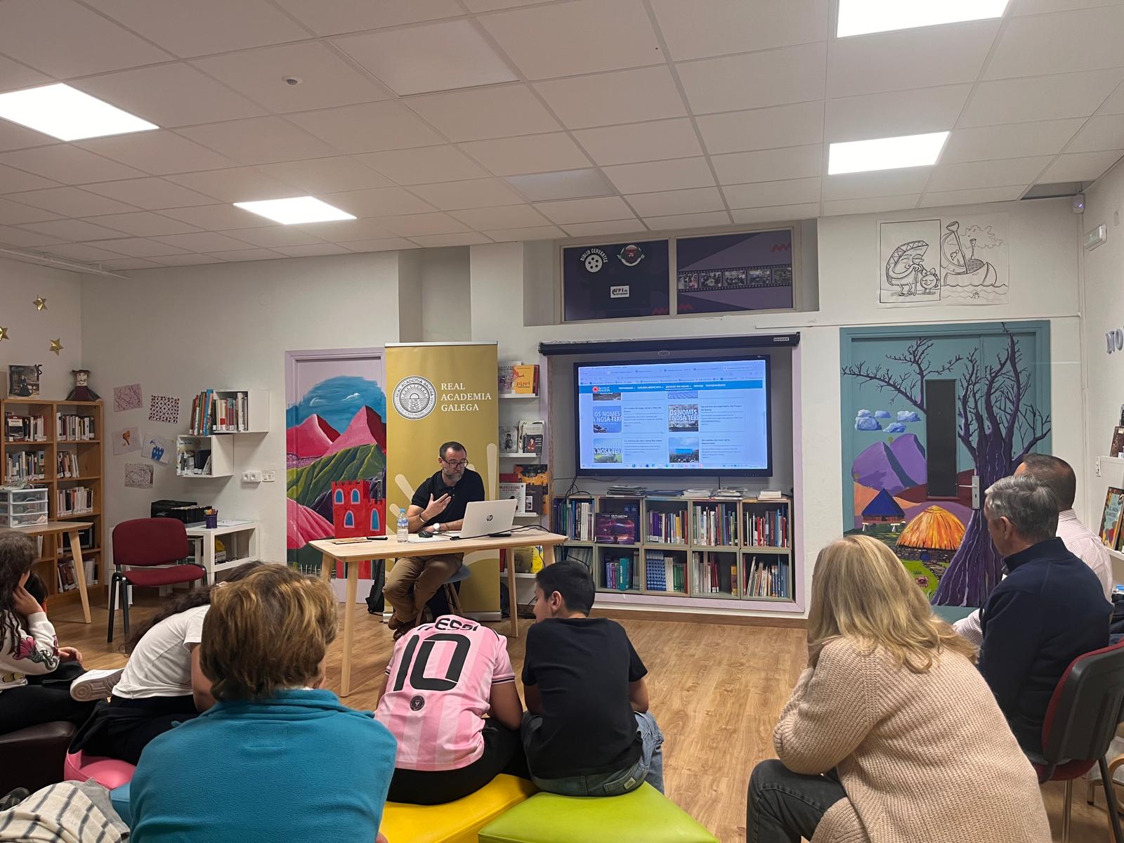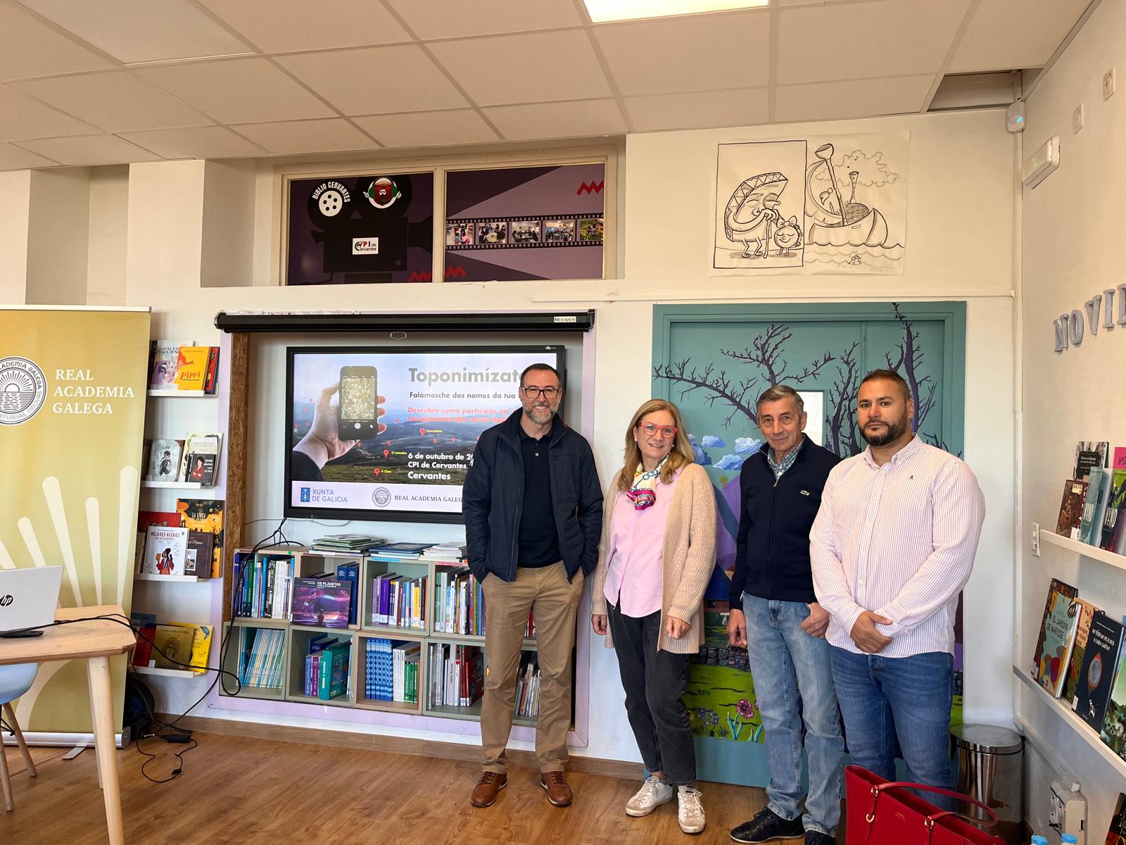 Vicente Feijoo, coordinador técnico del Seminario de Onomástica de la RAG y de Galicia Nomeada, habló a las nuevas generaciones de Cervantes sobre el importante papel que pueden desempeñar en este proyecto colectivo de salvaguarda de la toponimia menor (nombres de tierras, fuentes, arroyos, peñascos...). Ellos son el nuevo eslabón de una cadena de transmisión que ha sabido mantener los nombres de las tierras de generación en generación hasta nuestros días. Ahora les corresponde a ellos perpetuar la memoria de sus abuelos y abuelas a través de las nuevas tecnologías, por eso tomaron buena nota de cómo funcionaba la aplicación Galicia Nomeada. Además, tuvieron la suerte de escuchar a la señora Ofelia, una de las principales informantes de un proyecto promovido por el cineasta Óliver Laxe y llevado a cabo por una gran investigadora de la cultura popular y del patrimonio inmaterial, la arqueóloga e historiadora Ana Filgueiras Rei, también presente en el acto.